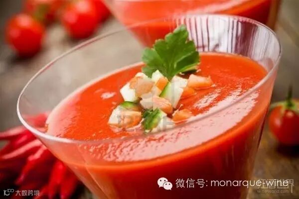 口感较清淡的新鲜西红柿汤可就着口感爽脆的干白(如摩纳克KING雷司令干白或阿尔巴利诺干白)享用。当然,你还可以选择经过冷冻的曼萨尼亚雪利酒(Manzanilla Sherry)搭配。而在品尝口感较浓的烤西红柿汤,搭配酒体适中的意大利或法国南部的干红或年轻的里奥哈干红则更合适。
