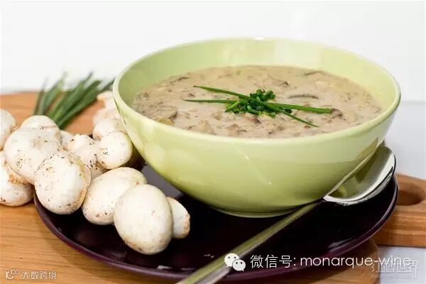 在为此类汤搭配葡萄酒时,如果汤的口感稍浓,则可与稍带橡木味的霞多丽葡萄酒搭配,如果口感稍淡,则黑皮诺葡萄酒是更明智的选择。