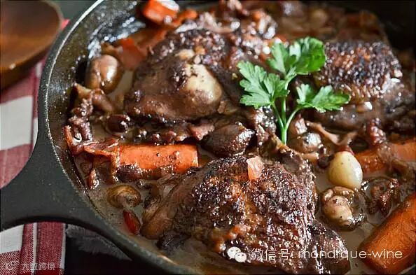 尽管餐酒搭配中讲究“红酒配红肉,白酒配白肉”,但这道菜肴以加入高汤炖煮方式的做成,香气浓郁,因此入菜的葡萄酒最好选择单宁含量较少、酒体中等的干型红葡萄酒与之构成平衡。而佐餐酒也可以选择同款红葡萄酒,如黑皮诺、歌海娜、仙粉黛等都是不错的选择。