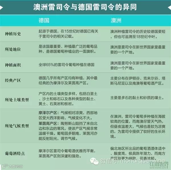 雷司令(Riesling)是除霞多丽之外最出名的白葡萄品种,它可以酿造除红葡萄酒以外的各类型葡萄酒:起泡酒、清新的高酸葡萄酒以及令人欢喜的甜酒。目前,全球多个国家均种植有该品种,而若要说到该品种生长的最佳葡萄酒产区,那德国和澳洲绝对是当仁不让。