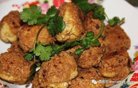 煎好的豆腐丸子,外酥里嫩,香而不腻。与怡园霞多丽干白葡萄酒搭配,丸子突然变得细腻精致起来,酒的香气也变得厚重,简单的一道菜,简单的一款葡萄酒,带来的是浓浓的幸福味道。
