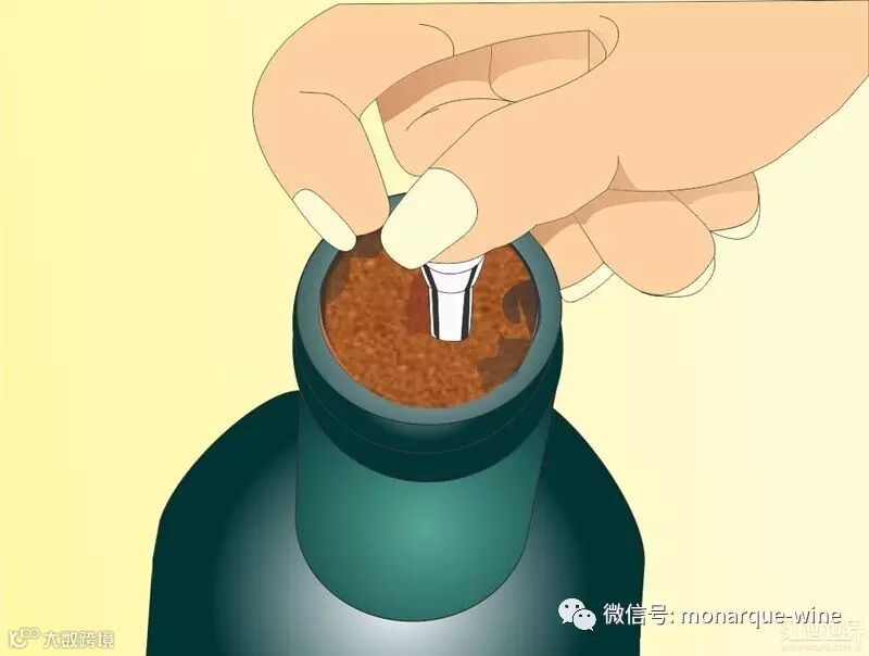 2. 用布或纸巾将瓶口擦拭干净,再将开瓶器的螺丝钻尖端垂直插入软木塞的中心(如果钻歪了,木塞容易被拔断),顺时针方向缓缓旋转钻入软木塞中。