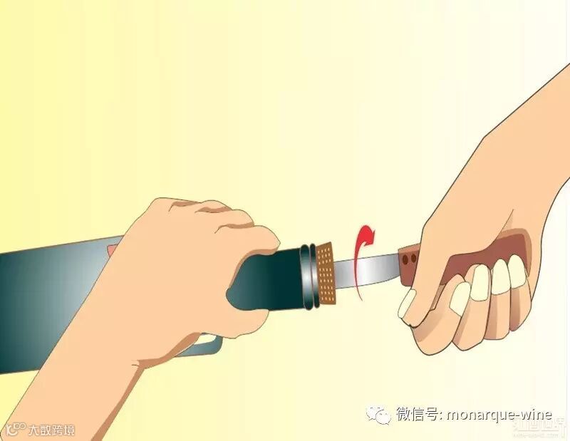 1. 先将酒瓶擦干净,再用开瓶器上的小刀沿防漏圈(瓶口凸出的圆圈状的部位)下方划一圈,切除瓶封,切记不要转动酒瓶。