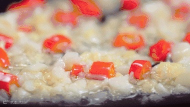3、热油锅,放入姜蒜末、辣椒段炒香后放入虾翻炒。