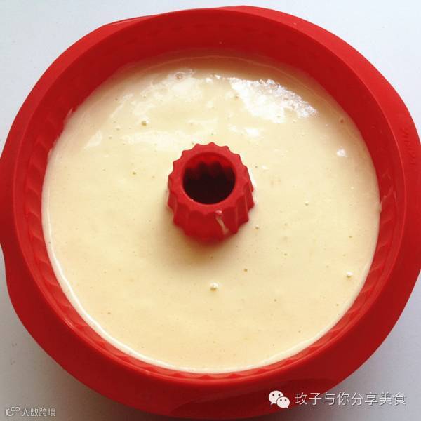 6、将搅拌好的蛋糕糊均匀倒入模具中,轻震出气泡, 放入预热好烤箱中下层,上下火150度烘烤50分钟。