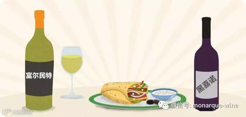 富尔民特葡萄酒的风味能够凸显卷饼中的牛至和迷迭香等草本风味,以及带有香料味的羊肉或鸡肉的味道,并且使得酸奶黄瓜酱的口感更佳。