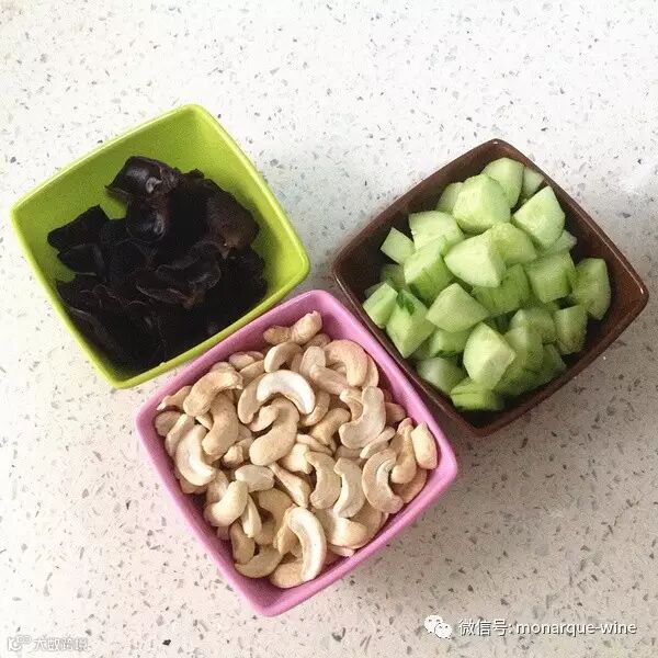 1、准备好配料,黑木耳泡发洗净,黄瓜刨皮切丁,腰果。