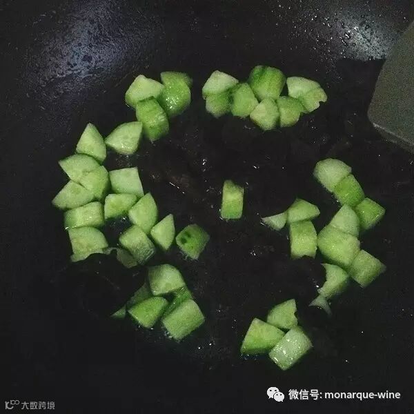 5、黄瓜丁、黑木耳下锅翻炒,加入少许盐调味。