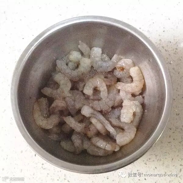 2、新鲜河虾去壳,挑掉虾线洗净,加料酒、淀粉、盐、生姜汁及来五香粉抓拌腌制半小时。