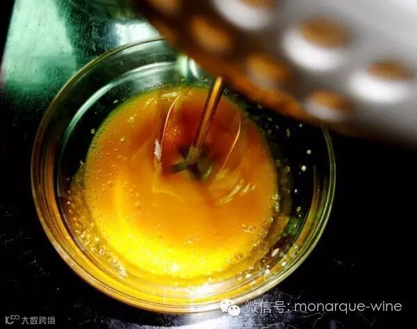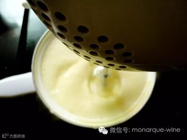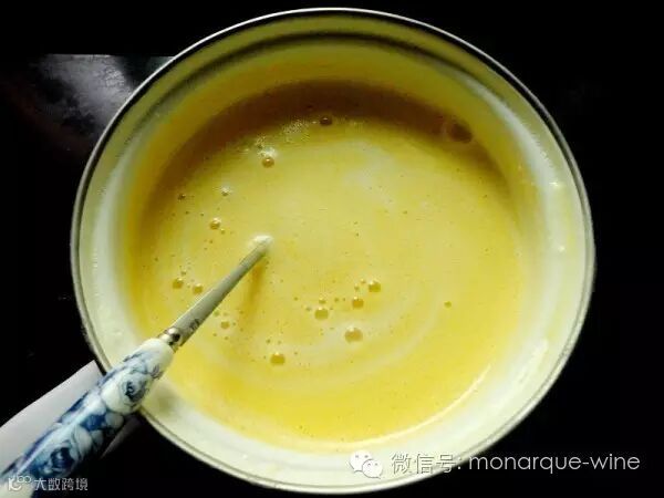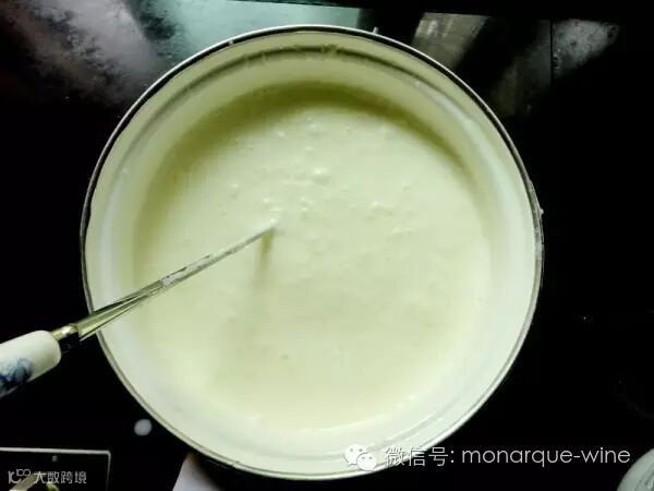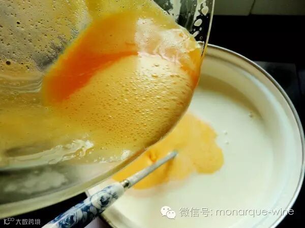 将蛋黄液倒入冷却(不烫即可,主要是防止蛋黄一倒进去就变成蛋花)后的牛奶液中