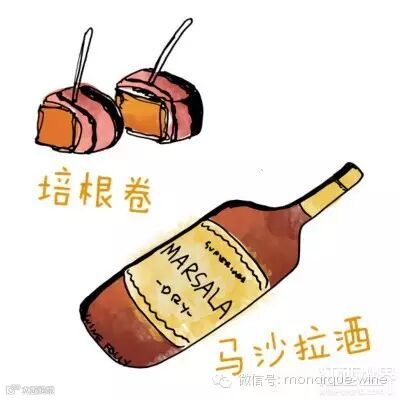 培根卷味道极好,油而不腻,肉香中带有烟熏香,需要一款甜味的葡萄酒来突出它的口味。马沙拉酒这款加强型葡萄酒不仅带来甜美的口感,还会增加一些烟熏或坚果的风味,为培根锦上添花!