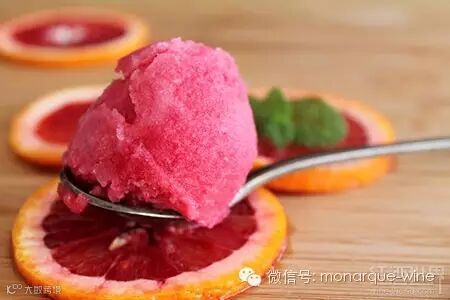 阿斯蒂莫斯卡托起泡酒(Moscato d'Asti)是血橙雪芭的绝配。事实上,这种半甜起泡酒适合搭配任何一种雪芭。把莫斯卡托起泡酒浇在血橙雪芭上,你就得到了一杯清爽怡人的浮动雪芭。而且,这种起泡酒的酒精度只有6%,你不用担心会喝醉。