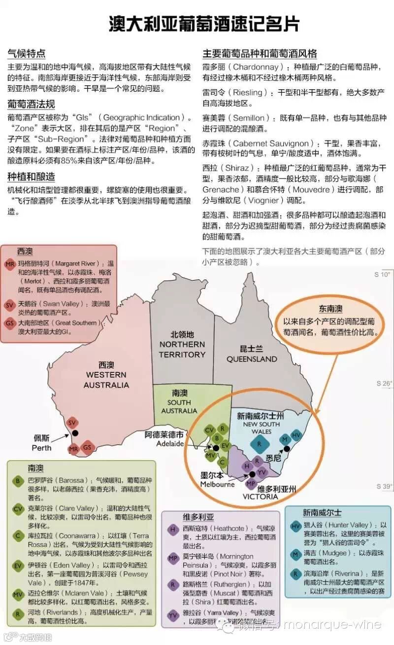 澳大利亚葡萄酒产区广阔,品种多样,学习起来相当费神。不过,有了下面这张条理清晰、重点突出、图文并茂的学习卡片,你就可以节省大量的时间和精力,轻松掌握澳大利亚葡萄酒的产区和品种情况!