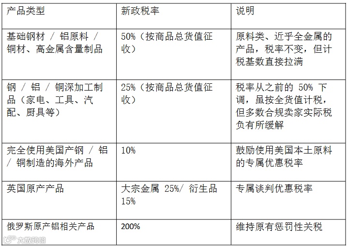 ①基础钢材、铝原料、铜材及高金属含量制品,依旧按 50% 征收,但计税基数直接按商品总货值计算;
