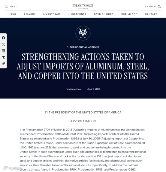 美东时间 2026 年 4 月 2 日,白宫突然发布重磅公告,对进口钢、铝、铜及相关制品的 232 关税体系启动全面改革,新政仅间隔 4 天便在 4 月 6 日 00:01 正式生效,这不是一次简单的税率调整,而是直接重构美线出口底层逻辑,所有对美出货的工贸企业与跨境卖家,都将直面这场政策风暴。