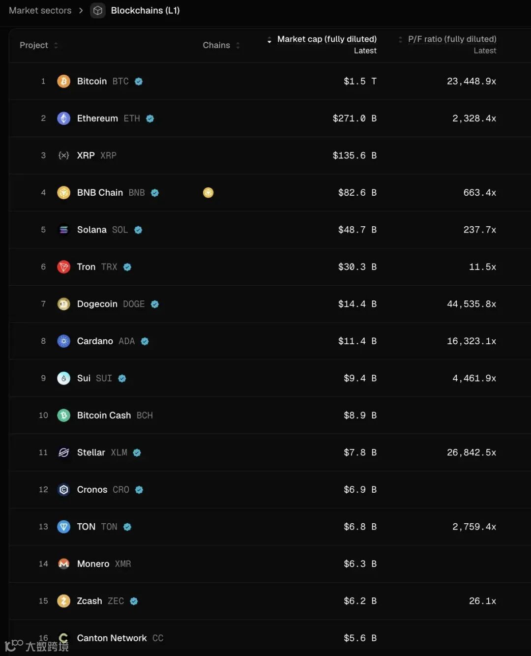 这意味着在未来,所有项目都将基于与公共股票相似的倍数(大约 2 到 30 倍的收入)进行估值。花点时间想一想这意味着什么——如果成真,我们将看到大多数 L1 公链的价格从现在起进一步下跌 95% 以上,只有 TRON、HYPE 和其他产生收入的 DeFi 项目等例外。这甚至还是在没有将代币归属考虑在内的情况。