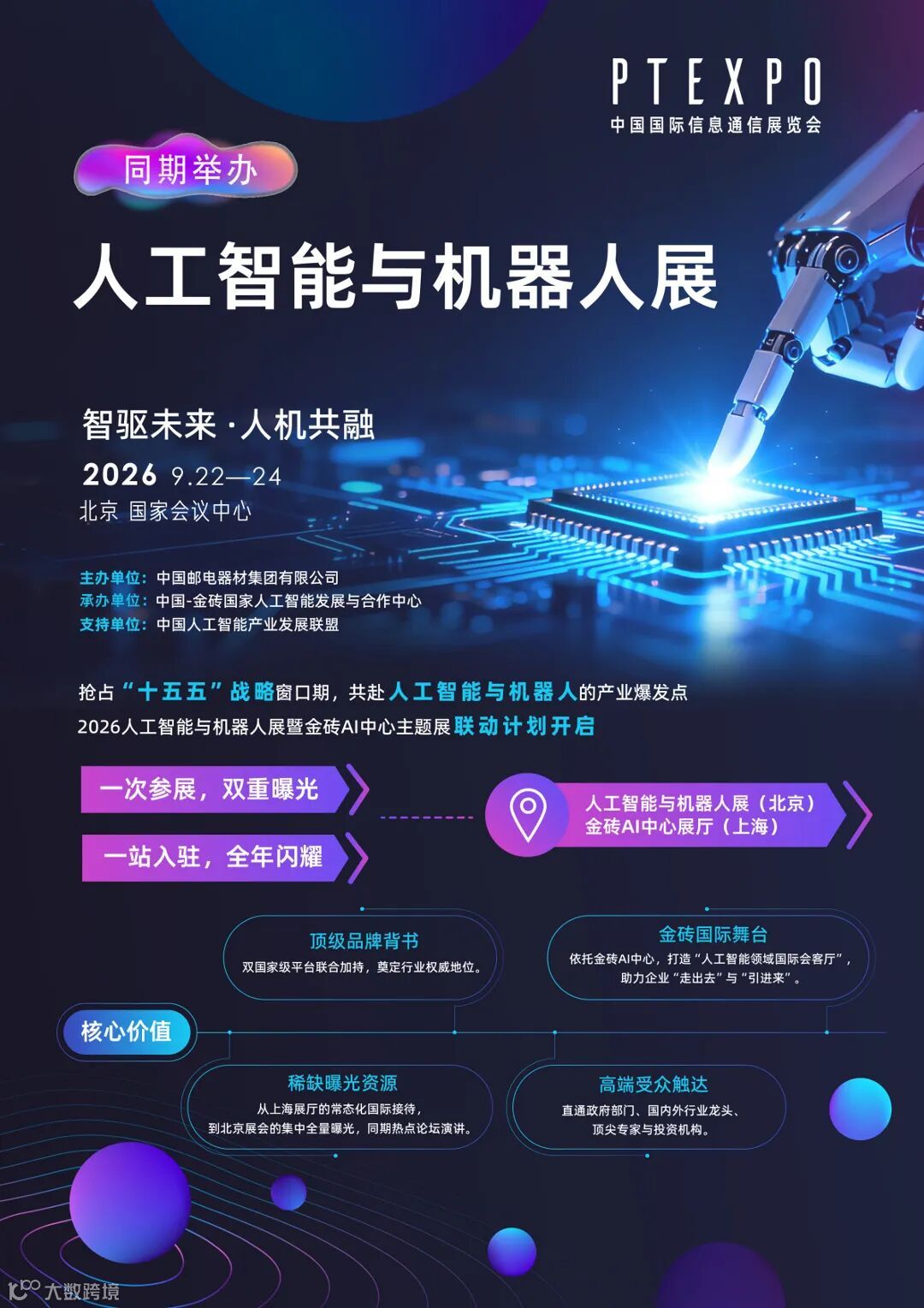 在此背景下,国家级平台强强联合:北京方面,依托亚洲最具影响力信息通信展--中国国际信息通信展览会(PT展),打造聚焦“智驱未来·人机共融”的垂直领域盛会,为企业创造对接桥梁,最大化商业回报。