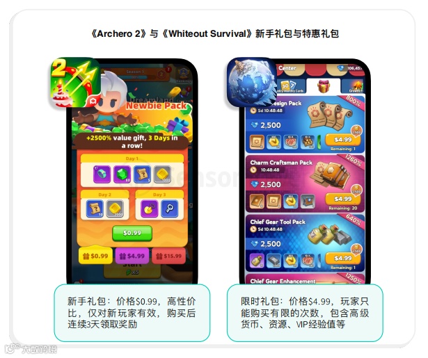 入门付费用户,有 0.99-4.99 美元的新手礼包、月卡、增益订阅。