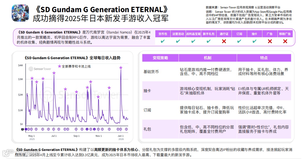 这款游戏在 2025 年拿下了日本新发手游收入冠军,上线后累计收入达到 3.3 亿美元。它的核心不是礼包卖得好,而是以高频更新的抽卡体系为核心,再用分层礼包和订阅去支撑整套内购系统。