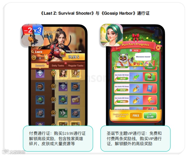 进阶付费用户,有 9.99-29.99 美元的基础通行证、玩法通行证、中档礼包。