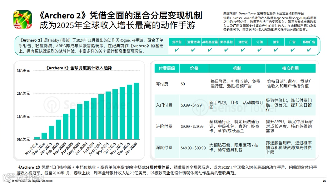报告里提到,《Archero 2》在 2025 年成为全球收入增长最高的动作手游,截至 2026 年 1 月,上线一周年累计收入达到 2.5 亿美元。