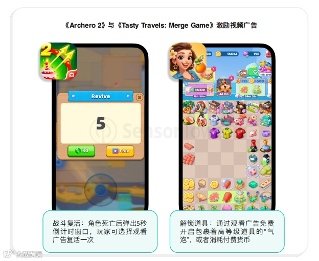 比如《Archero 2》和《Tasty Travels: Merge Game》这类产品里,激励视频广告不是一个边角料位,而是被深度整合进游戏推进节奏里:资源不够时看广告、卡关时看广告、复活时看广告、拿道具时看广告。