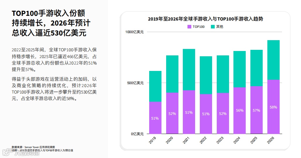 一; 2025 年全球 TOP100 手游收入已经逼近 466 亿美元,预计 2026 年会进一步涨到 约 530 亿美元,占全球手游总收入接近 58%。