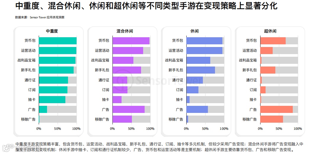 报告里提到,中重度手游会把货币包、活动、宝箱、新手礼包、通行证、订阅、抽卡这些东西基本配齐,但广告会相对少;