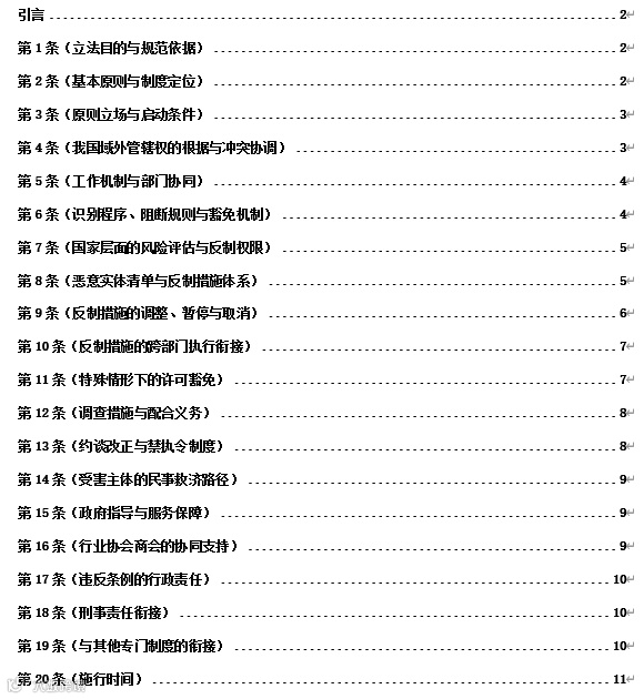 从条文结构看,条例虽然只有20条,但制度链条完整,形成“原则立场—识别与阻断—国家反制与恶意实体清单—禁执令—民事救济—责任追究—与其他专门制度衔接”的基本框架。它与《中华人民共和国对外关系法》《中华人民共和国反外国制裁法》以及数据安全、出口管制、反垄断、司法协助等既有规则并不是替代关系,而更像是一部统领性、衔接性的涉外应对规范。