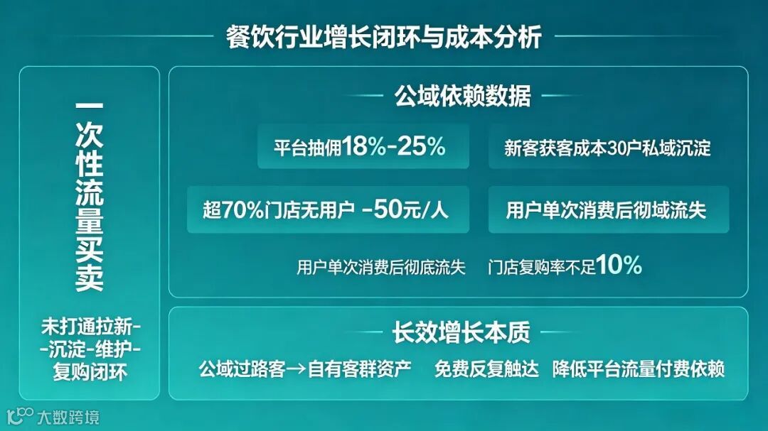 核心症结是只做了"一次性流量买卖",未打通"拉新-沉淀-维护-复购"的完整增长闭环。行业数据显示,依赖公域平台的餐饮门店,平台抽佣普遍在18%-25%,新客获客成本高达30-50元/人,而超70%的门店未做用户私域沉淀,单次消费后用户彻底流失,门店复购率不足10%。