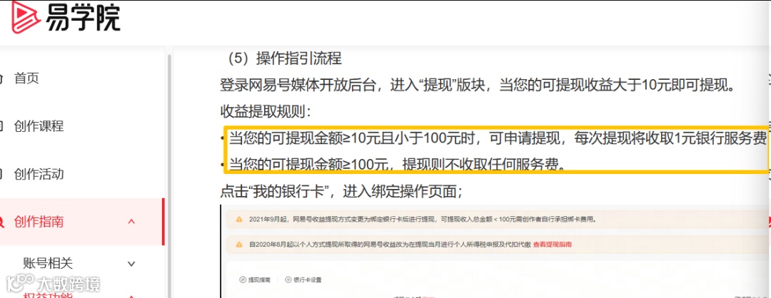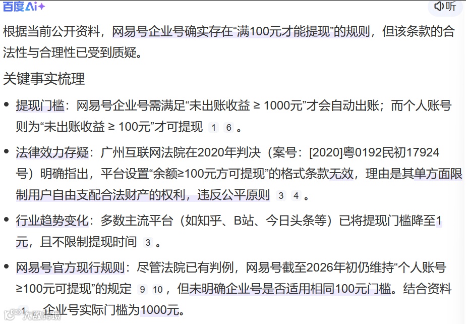 AI只能作为参考,并不一定全对。打开网某号后台账号提现页面显示:个人账号收益大于10元即可提现,只不过10-100元提现收取1元银行服务费,大于100元提现不收取任何服务费,不是AI说得满100才能提现。