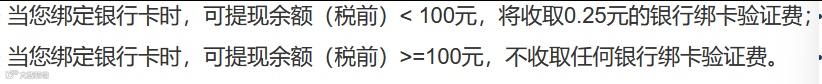 个人账号绑定银行卡的提现的时候,税前余额小于100元的话会收取0.25元的银行绑卡验证费;大于等于100元不收取任何银行绑卡验证费。