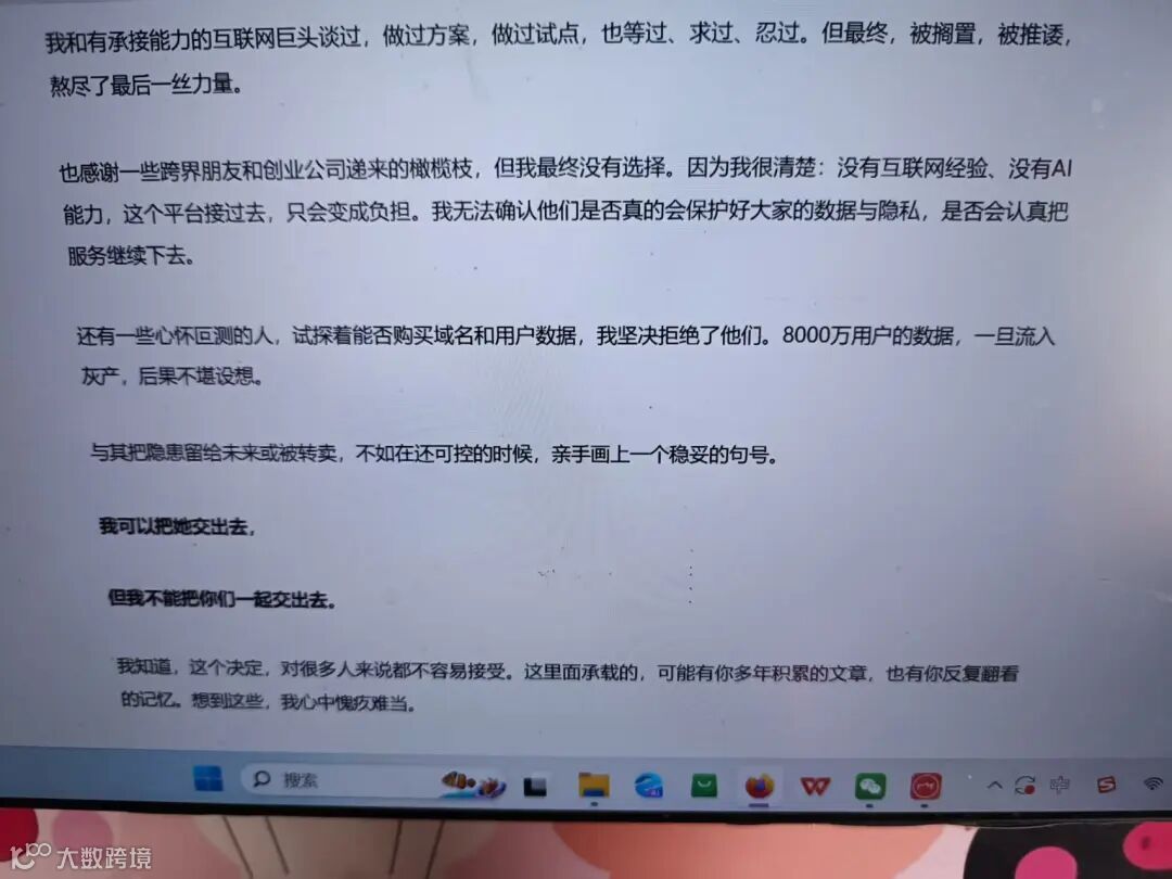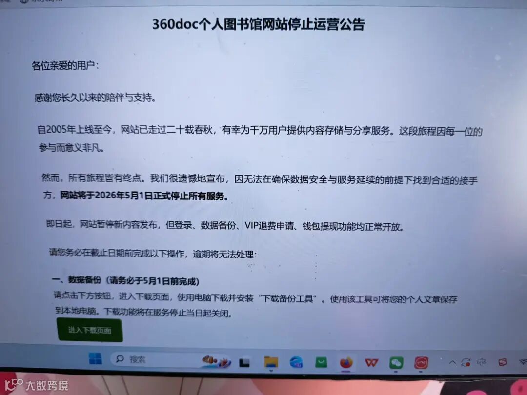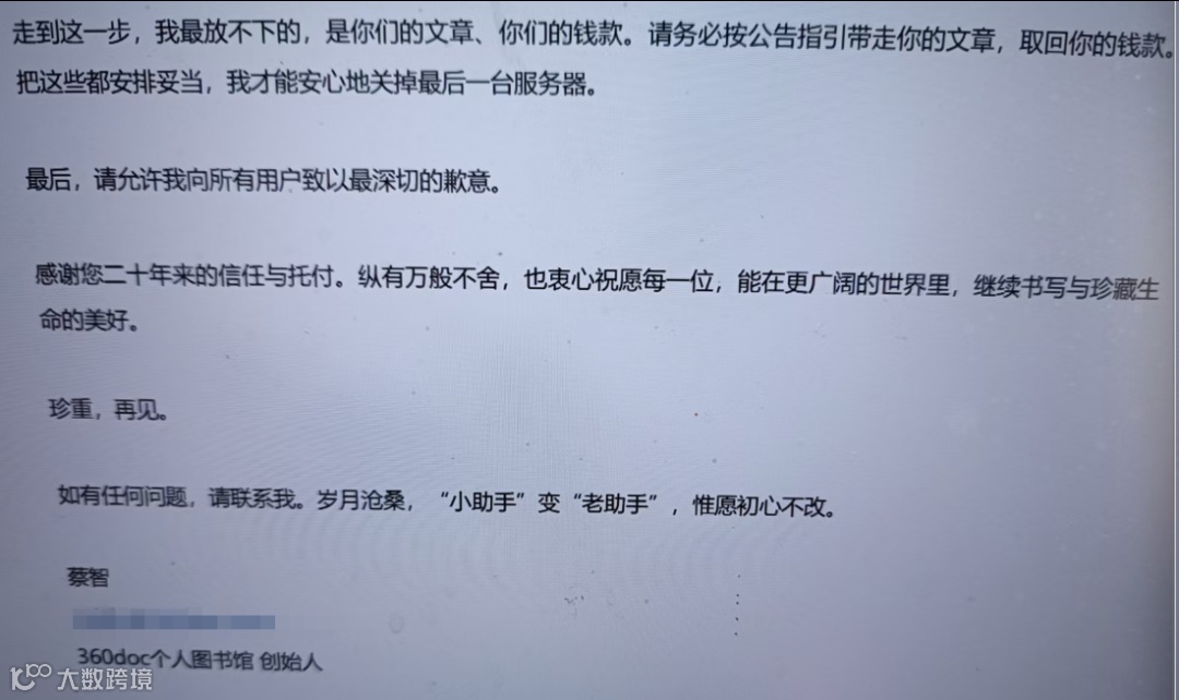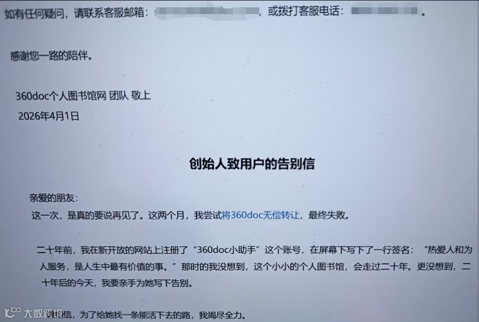 20载春秋,360doc个人图书馆真的要跟大家告别说再见了。无偿转让失败,只有选择关闭。有人要购买域名和用户数据,被它们拒绝了。信里有邮箱和联系电话,有问题可以打电话也可以发邮件。20年一个人从刚出生到上大二,创办企业就跟养孩子一样,只有经历的人才知道其中的艰辛,非常惋惜!