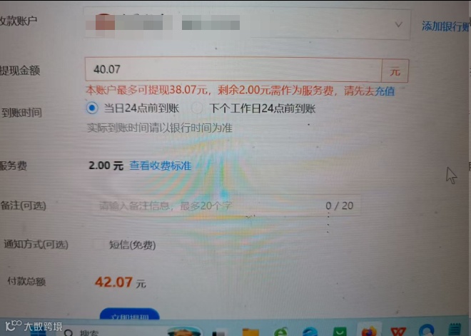 提现的时候有个手续费选择,当日24点前到账要扣手续费,0-10万元包括10万,扣0.2%手续费,最低扣2元最高扣25元,10万-500万扣0.025%,当日和单笔限额都是500万,40.07元如果选择当天24点前到账,扣2元手续费剩下38.07元。选择下个工作日24点前到账的话,免费不扣手续费。