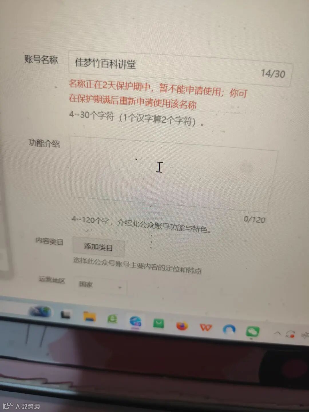 这两天本来打算把佳梦竹百科讲堂个人公众号升级成企业公众号,但是公众号不能升级只能进行迁移。迁移的时候,得先注册一个新的企业账号,然后在佳梦竹百科讲堂老账号上申请迁移,迁移有迁移费用好像是300元,新注册的企业号名字第一次免费,第二次更改名字就得交300元,把佳梦竹百科讲堂个人号上的内容迁移到新注册的企业号上,新注册的企业号名字还是用佳梦竹百科讲堂这个名字,结果输入佳梦竹百科讲堂后提示名字重复,公众号名字唯一性,网上有人发视频迁移的时候要用原来老号的名字,可是重复怎么办呢?注册新号的时候,输入原来号的名字后面加个X01或者X,迁移的时候名称就可以覆盖延续使用原来的名字。因此,我把新注册的企业号名字写成了佳梦竹百科讲堂01.