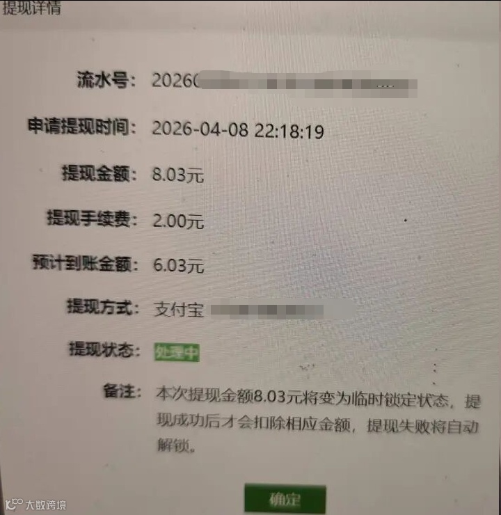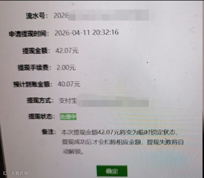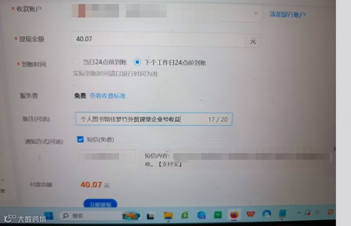 前两天偶然打开佳梦竹外贸课堂个人图书馆,这42.07元到钱包余额了,可以申请提现了。既然可以提了,那就提吧!尽管注册的时候后台绑定的对公账户,但是这次提现只能提到支某宝里,几年前注册了个支某宝企业号,输入密码进入了,除了登录密码还有个支付密码,支付密码输几次输不对,又重置才好了,当天晚上支某宝企业号就到账了扣除2元手续费,剩下40.07元。到账后,后台会有消息提醒:您提现的金额到账了请查收还有电话号码有疑问打电话。