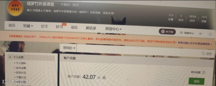 打开个人图书馆佳梦竹外贸课堂后台,钱包是0,未结算收益42.07元。某条,百某号和网某号企业账号提现都有个最低金额要求:某条满5千,百某号满1千,网某号满100元。虽然某度AI提示:广州互联网court在2020年判决了一个案件指出:平台设置大于等于100元才可提现的条款无效,违反公平原则,多数平台将提现金额降到1元。网某号个人账号仍维持个人账号大于等于100元的规定,结合资料,企业号提现实际门槛为1000元。