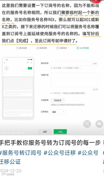 有一种办法:老的个人号佳梦竹百科讲堂名字改成了许小竹我的曾用名干脆当成我个人号发算了,家人亲戚也都叫我小竹,疫情期间某条上佳梦竹百科讲堂个人号也开了个小竹书院视频合集,新注册的企业号交300元认证蓝V改名把佳梦竹百科讲堂01改成佳梦竹百科讲堂,从新运营从零开始,绑定公户,收益进公账。这个时候问题来了,公众号许小竹这个名字可以用,视频号有人已经用了这个许小竹了,这样会导致公众号和视频号名字完全不一致,商标网一看好几个企业把小竹这个名字也注册商标了,要长期运营许小竹这个名字也用不了,哎!