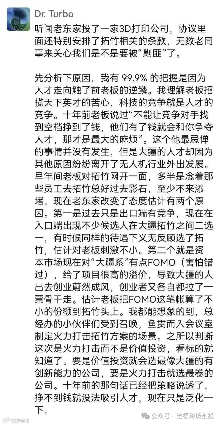 这直接激怒了大疆,不光专门设置了涉及拓竹的竞业限制条例,还光速投资了一家3D打印公司,直接“围剿”拓竹。