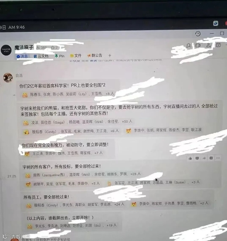 在这张截图中,疑似追觅的老板俞浩当场发飙,怒斥团队:“没有魄力,被动防守”。并且接连发布了N条强硬指令: