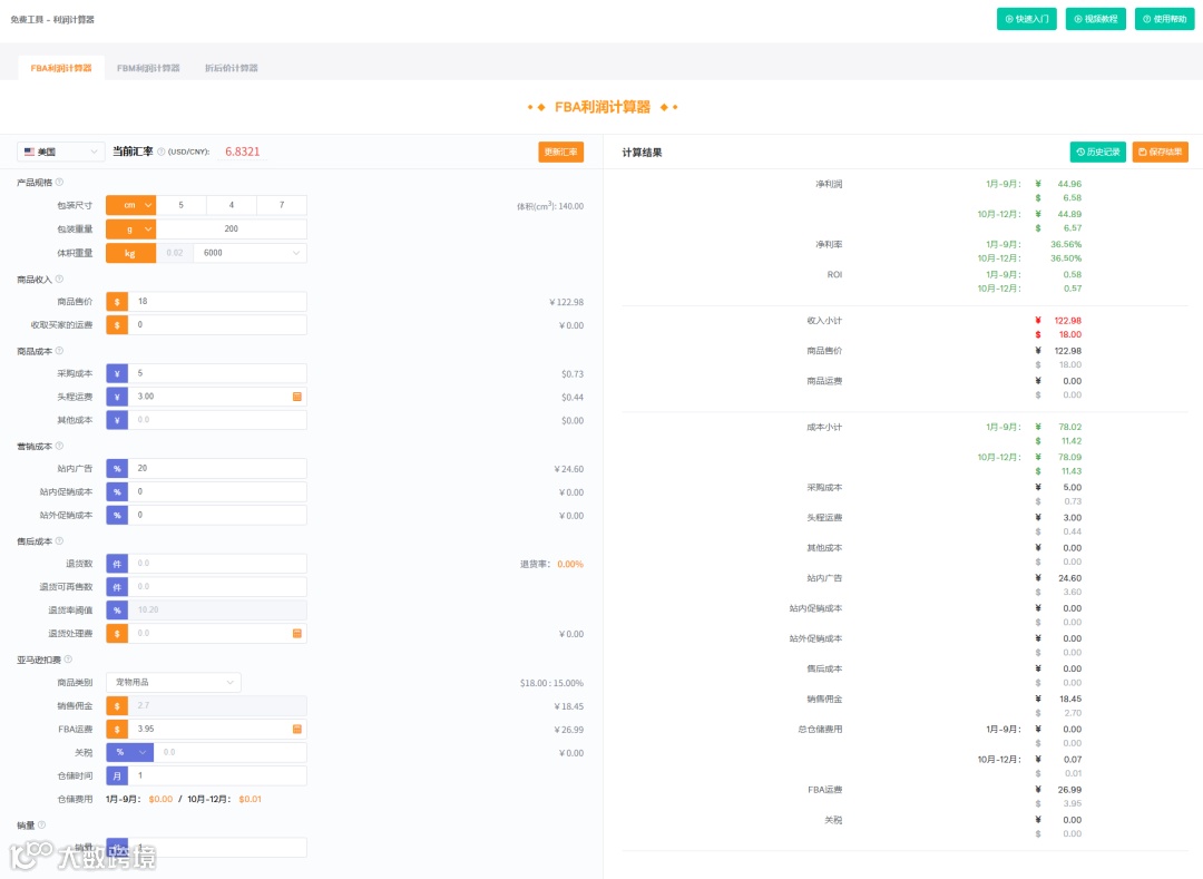 1、利润核算:利用卖家精灵的“利润计算器”,输入产品的售价、采购成本、头程物流费、平台佣金、广告占比等信息,工具自动核算净利润率、回本周期,无需人工计算,精准高效,确保净利润率≥25%。