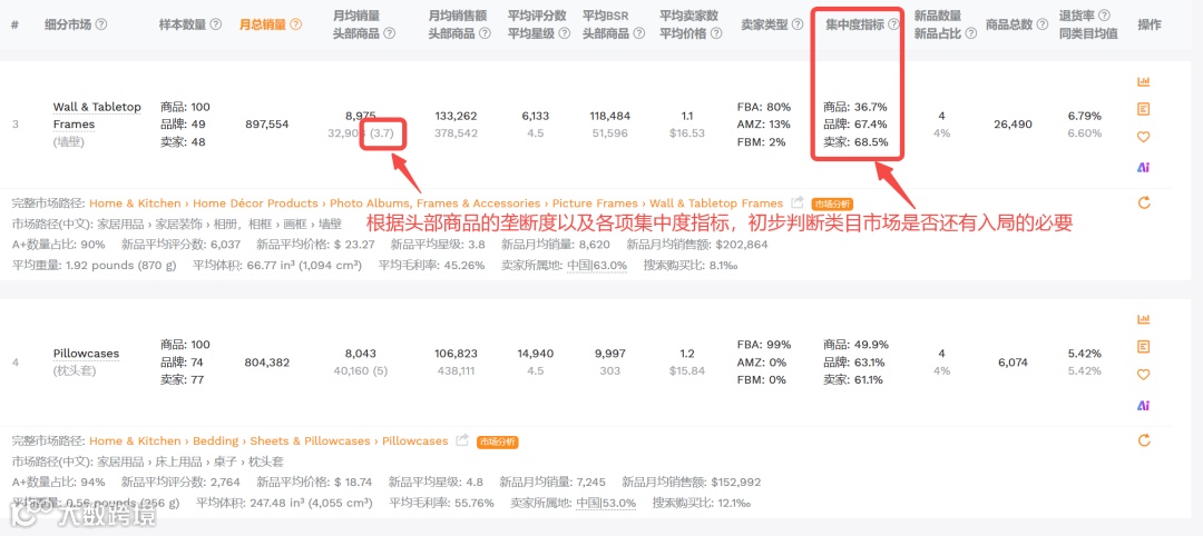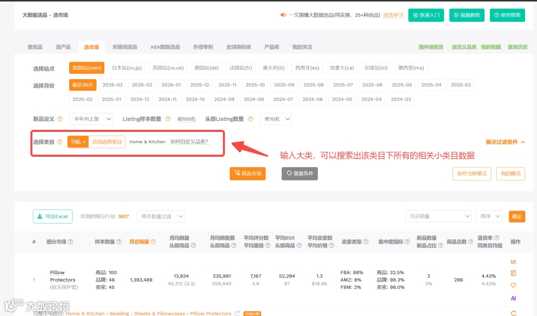 -- 通过卖家精灵的“选市场”功能,选择新手友好大类目(如家居、宠物),筛选出“低垄断度、相对高流量”的细分子类目,快速避开红海。