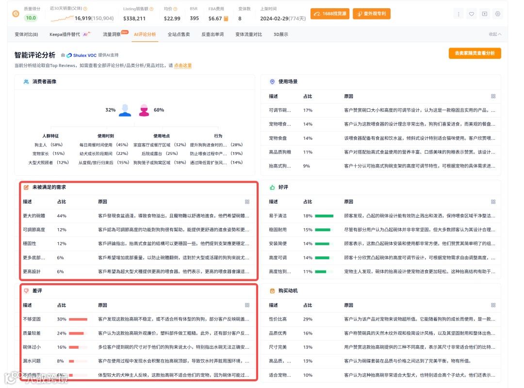 3、差异点挖掘:通过卖家精灵的“评论分析”功能,自动提炼竞品的差评关键词(如“不够牢固”“碗过小”等),结合自身供应链优势,针对性优化产品;同时参考竞品的定价策略,确定自身产品的合理定价区间,确保利润达标。