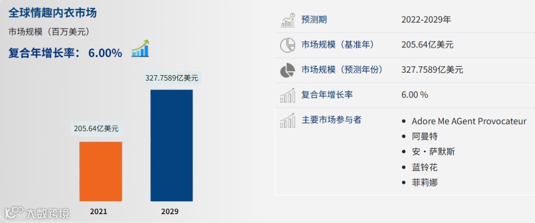 全球情趣内衣市场2021年规模205.64亿美元,预计2029年增至327.76亿美元,2022-2029年复合年增长率6.00%。
