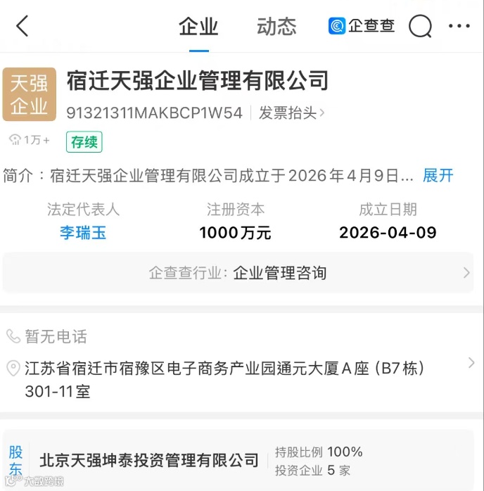 宿迁天强企业管理有限公司悄然成立。注册资本1000万元,法定代表人李瑞玉。经股权穿透,最终控制人为刘强东和章泽天夫妇。