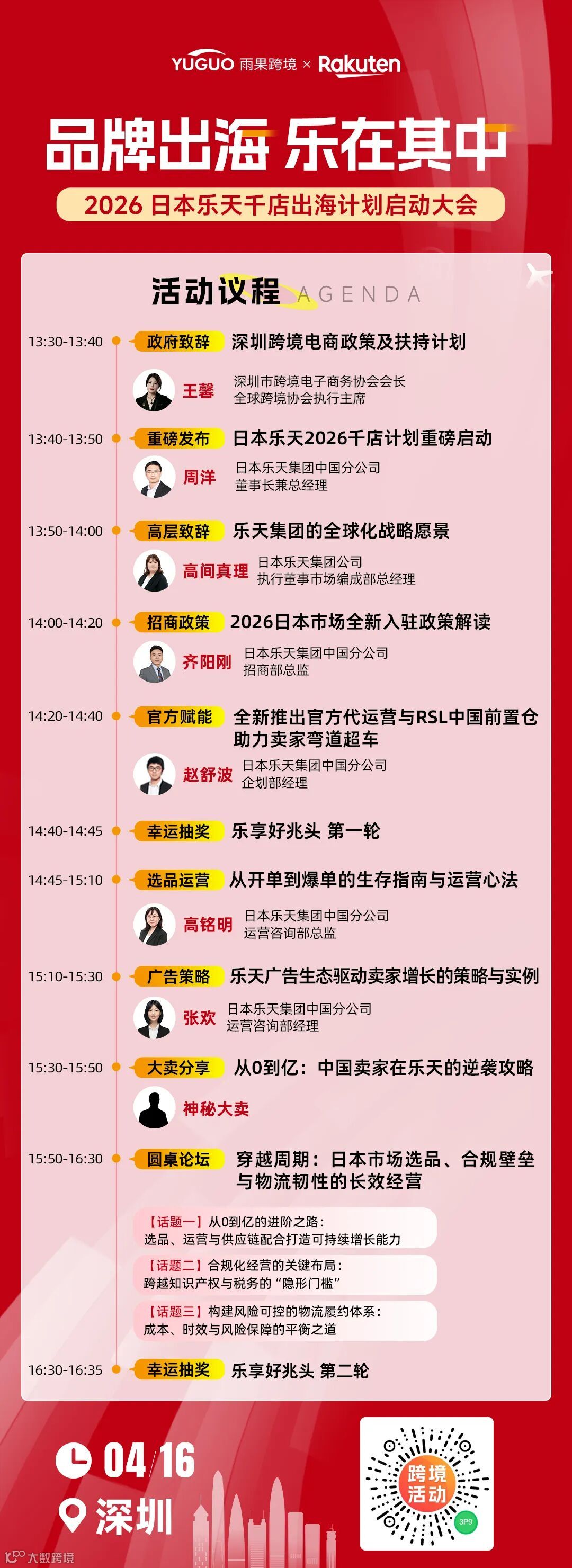 日本乐天正式推出2026年「千店出海计划」,目标年内助力1000家中国优质商家落地日本市场,并提供从入驻、运营、流量扶持到品牌增长的全周期官方赋能。作为战略起点,日本乐天将于2026年4月16日在深圳罗湖区瑞吉酒店举办启动大会,为商家打开对接日本市场的快速通道。
