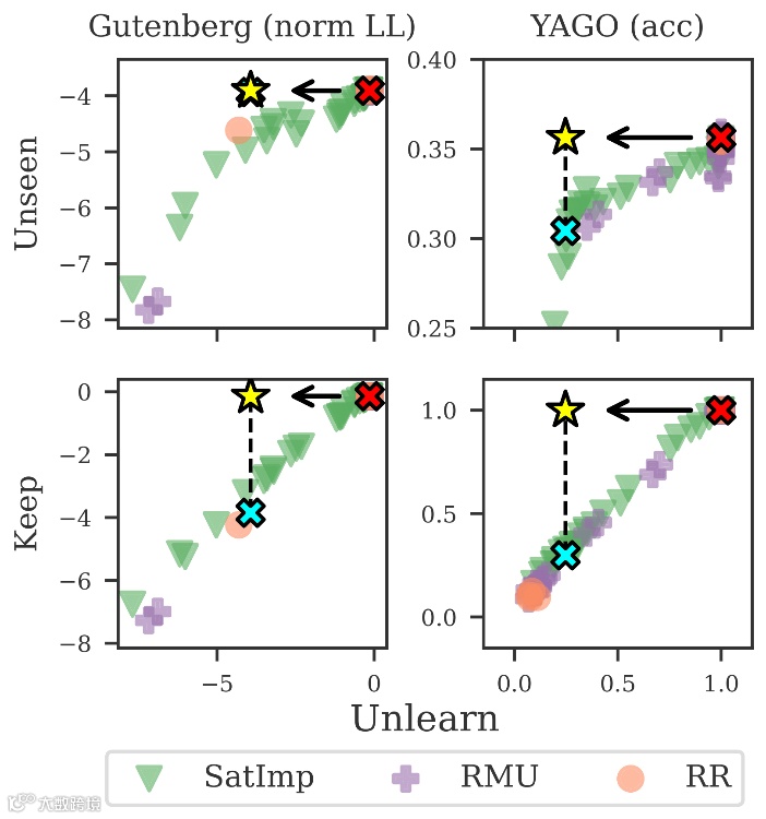 针对业界寄望的"机器遗忘"技术(如RMU、RR、SatImp算法),团队在8B参数扰动模型上进行实测:要求精确删除"Unlearn集"的同时保留关联"Keep集"与通用能力。结果显示,即使最优的SatImp算法也无法实现无损擦除——或删不彻底,或损伤模型正常推理能力。根本原因在于Dense Transformer架构的知识高度分布式特性,验证了"预训练阶段防控记忆风险优于事后补救"的工程原则。