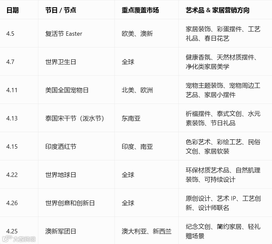 四月春暖花开,全球艺术品、工艺礼品及家居软装迎来出海旺季。从复活节到地球日,艺术与家居类消费热潮持续升温,无锡艺术品跨境电商产业园整合海外节点与实战场景,为企业提供精准营销指南。