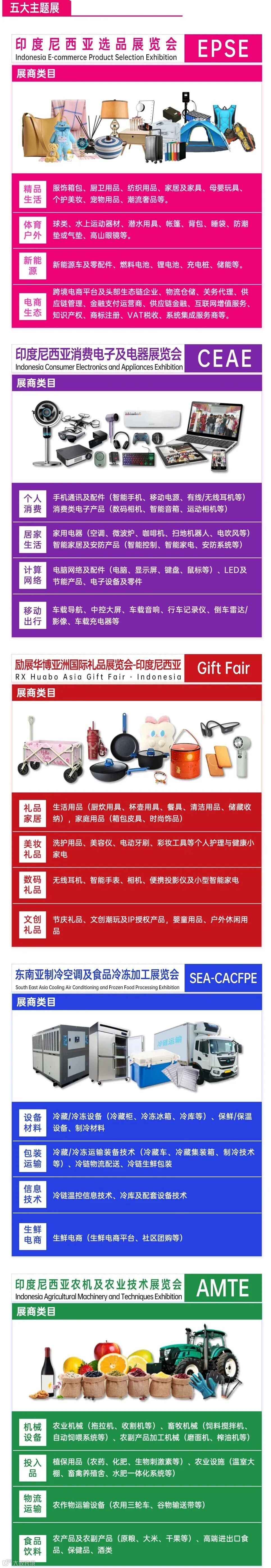 展会聚焦五大垂直领域:EPSE印尼选品展、CEAE消费电子及电器展、RX Huabo亚洲礼品展、SEA-CACFPE制冷冷冻展、AMTE农机及农业技术展,全面覆盖服饰、家电、礼品、冷链及农机等品类。