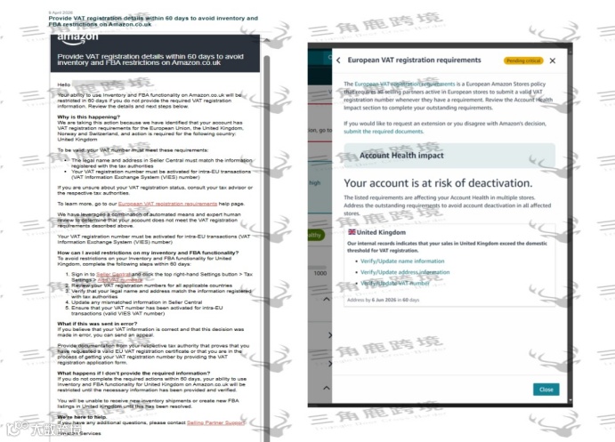 近期,多位亚马逊英国本土店铺(UK Local Account)卖家报告收到税务合规审查通知,平台要求限期提交有效英国VAT税号,逾期未通过验证将导致销售权限受限或账户封停。